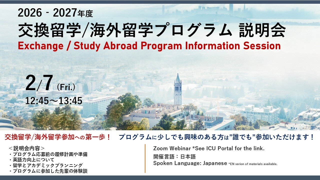 【開催終了/録画公開中】2026-27年度対象 交換/海外留学プログラム説明会① Exchange/Study Abroad Program Information Sessions ①